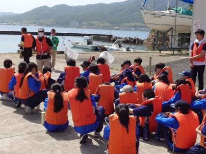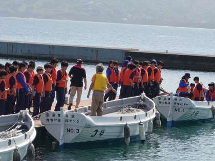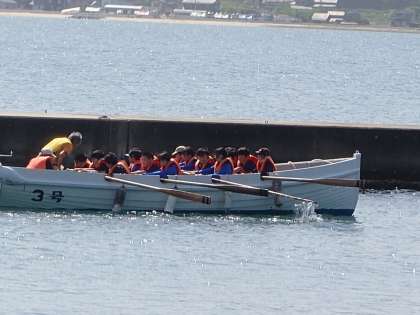 マリンピアでのメインの取り組みである、カッター体験です。はじめに櫂(かい)の使い方など説明を受け、ライフジャケットを着てカッターに乗り込みました。櫂はなかなか重く、上手く扱えないところもありましたが、慣れてくると順調に進んでいる様子が見れました。