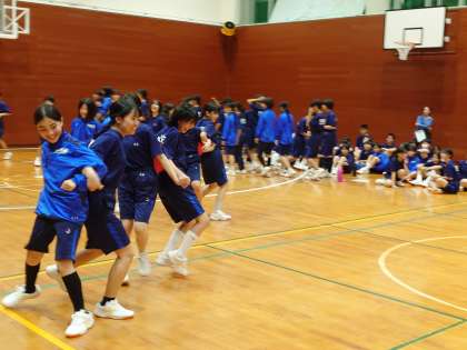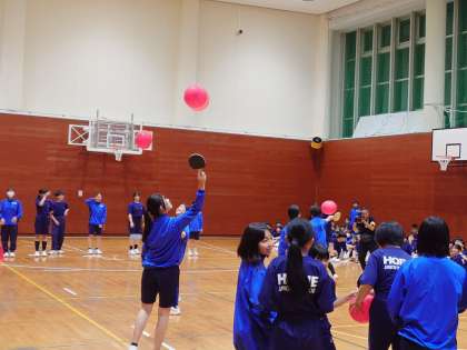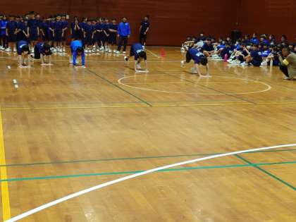 室内レクリエーションが始まりました。雑巾掛けレースやくじ引き、風船を使ったレースなどが行われました。