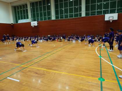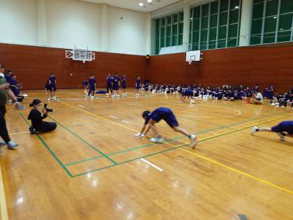 室内レクリエーションがスタートしました。1つ目の競技は、雑巾掛けリレーです。雑巾をバトン代わりに男女4人でゴールを目指します。