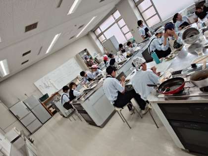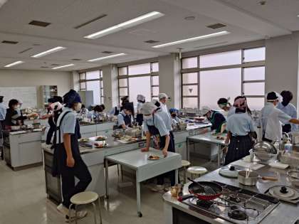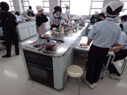 2年生の家庭科で調理実習を行いました。ハンバーグの作成です。付け合わせの野菜も調理し、完成した班から食べ始めています。