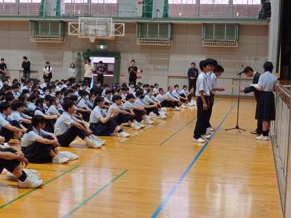 本日ははじめに、週末に行われた大阪市春季総合体育大会で優秀な成績を残した生徒たちに、表彰状の伝達が行われました。日々の努力の積み重ねの結果です。これからも、頑張ってください。