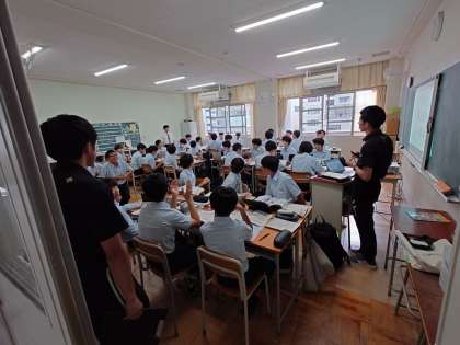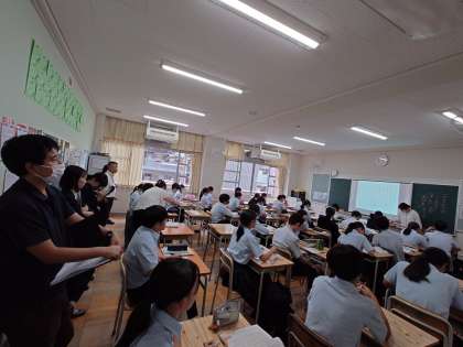3年生全7学級の授業に、授業者以外のすべての教員が参観を行います。その後の研究協議会では、授業者と参観者がグループとなり、その授業について討議、発表をするという流れになります。