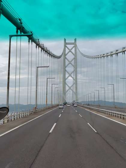 明石海峡大橋を走行しています。まもなく淡路サービスエリアに到着し、小休止します。