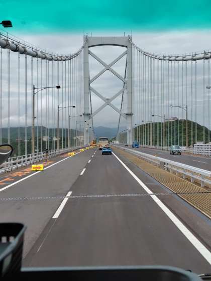 大鳴門橋を渡り、バスは徳島県鳴門市に入りました。お天気がこのままもってくれたら、と思うばかりです。私の乗っているバス内(3号車)は、音楽を聴きながらくつろいでいます。ほかのバス内はどうでしょうか。