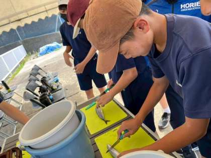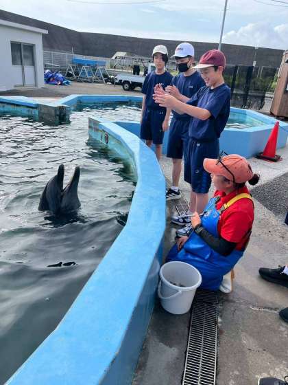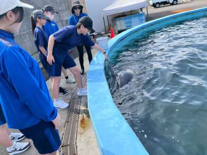 イルカとのふれあい体験の様子です。何とも言えない肌ざわりのイルカに子どもたちの笑顔があふれています。そして、エサの準備も行いました。