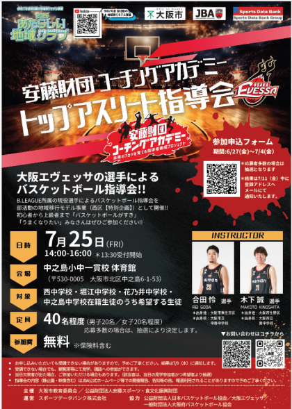 さて、現在大阪市の取り組みとして行っている「新しい地域クラブ」の開催におきまして、特別企画として開催をする大阪エヴェッサ選手によるバスケットボール指導会のチラシ及び案内がありましたので、チラシデータの送付をさせていただきます。