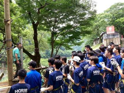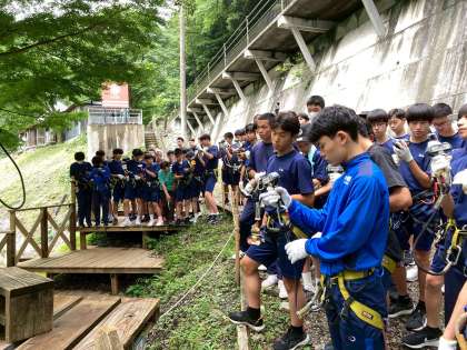 ツリートレッキングが始まろうとしています。命綱のあつかいなどのレクチャーを受けているところです。