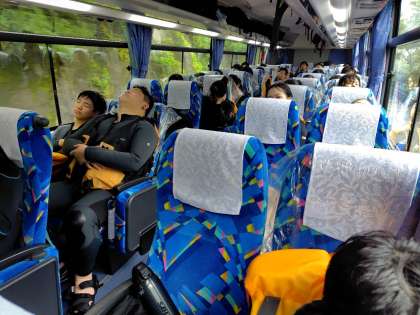 ラフティングが終わり、ベースに戻る車中です。楽しみすぎて、一時、小休止 Zzzzz……