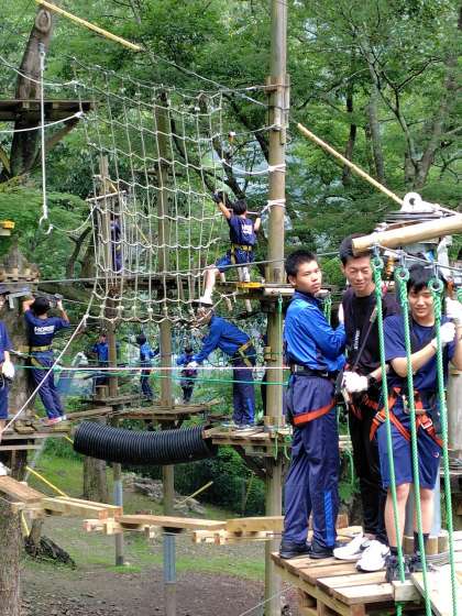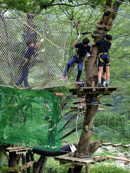 ツリートレッキングのようすです。命綱をかけ、木と木の間に渡した不安定な吊り橋などを渡っていきます。
