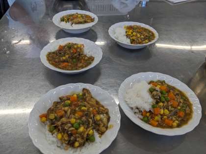 2年生は、家庭科の授業で調理実習を行いました。メニューはサバカレーですが、今回の調理実習はいつもとは違います。