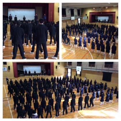 1年生が、「3年を送る会」の練習をしました。朝、昼休みと呼びかけ隊のみんなが練習をし、その人たちが1年生全体に呼びかけ、みんなで声を出し合う練習をしました。朝一番ということで、なかなか大きな声が出ません。何度も練習をし、ようやく大きな声が出るようになりました。