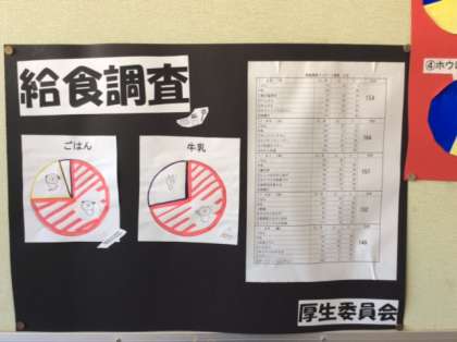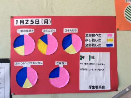 校長だよりに速報をグラフで掲載しましたが、厚生委員会で、給食の残食調査をわかりやすくまとめてくれました。1,2年生の廊下に掲示しています。まとめてくれた分を写真に撮りました。