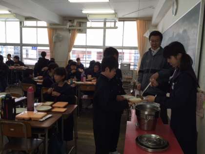今日から学校給食は、全ての学年で喫食することになりました。人数が多くなる分配膳も大変ですが、しっかりとバランスよく食べて栄養をつけましょう。