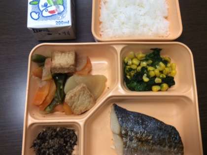 本日のメニューは、さごしの塩焼き、厚揚げとジャガイモの煮物、ほうれん草とコーンのおひたし、牛ひじきそぼろ。1年生は、6限部活動紹介があります。