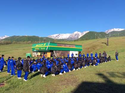 おはようございます。昨夜は夕食後、エコーランドでの買い物。宿舎にもどって、1日の振り返り。みんなグッスリ眠れたようです。特に、良好な健康状況です。雲ひとつない白馬の山々をバックに朝の集いを行いました。その後、朝食をとり、この後は、EXアドベンチャーに向け出発です。