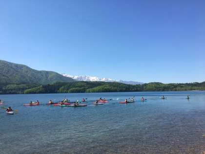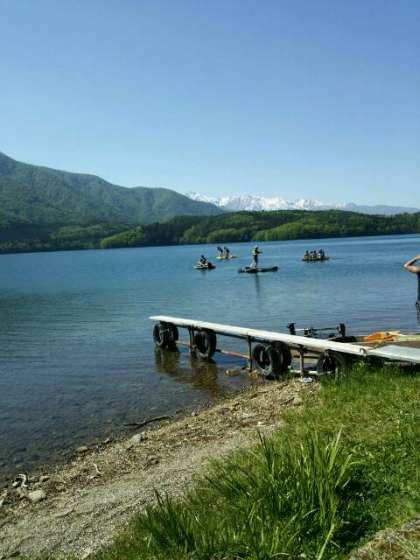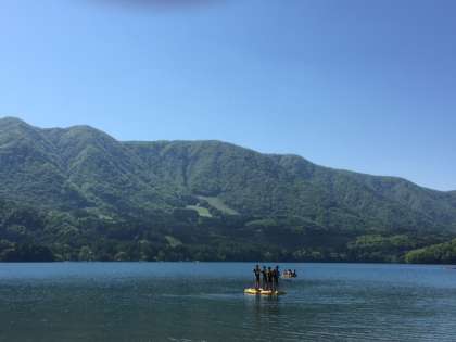 力を合わせてつくったイカダで青木湖に繰り出しました!イカダに乗った少年少女たちです。周囲の景色が、まるで別天地のようです。