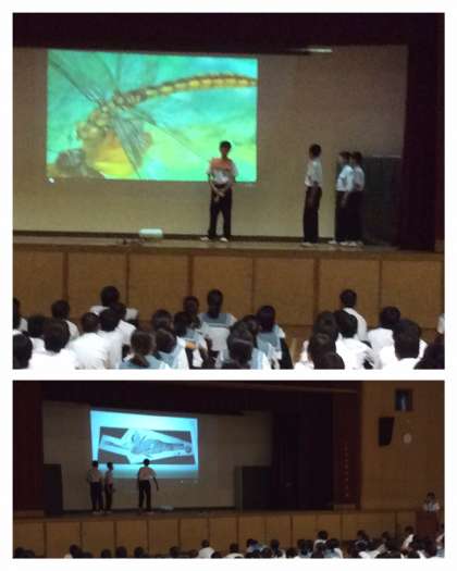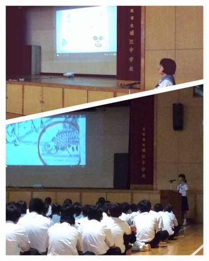 二年生は、校外学習に大阪市の施設を訪問し、調べ学習をしてきました。それをタブレットを使って、各クラスの代表班の人が、学年のみんなに発表してくれました。一般の方からの調査の依頼があり、それに応えるという形式で発表会が進みました。一番初めの班は、機械トラブルなどでなかなか手こずっていました。だんだんと、操作方法になれた人たちが画像をわかりやすく発表してくれました。最後の班などは、映像にプラスして寸劇まで入る熱心さ。おかげで楽しい発表会だったと思います。