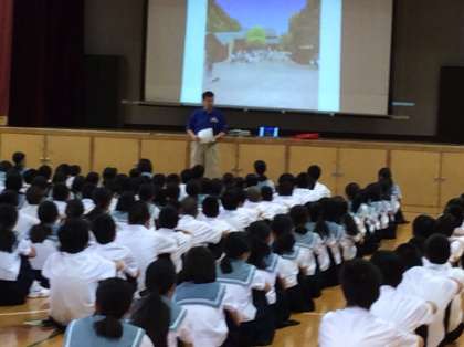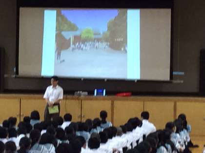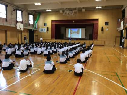 6日(月)1限、一年生は、19日(日)〜20日(月)に行われる一泊移住の取り組みを始めました。今日は、体育館で、しおりをもとに説明が行われました。
