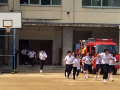 6月15日(水)5限目、地震と津波による避難訓練を行いました。緊急地震速報が流れた後はすぐに、机の下にもぐり身を守る行動をとり、そのまま、落ち着いて放送や先生の指示をよく聞くことが大切です。安全確認ができたら避難開始です。避難開始から集合・点呼が完了するまでの時間は3分8秒かかりました。殆どの人が、しっかり訓練をしていましたが、中には、笑ったり、しゃべったりしている人がいたのは、少し残念でした。
