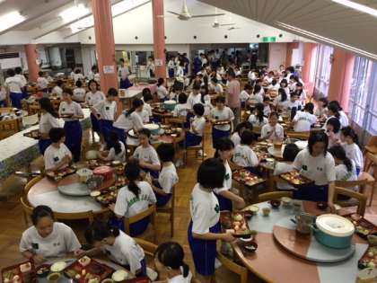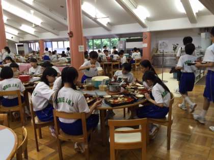 夕食はセルフサービスで、班ごとに揃ったところから「いただきます」をしました。綱引きでエキサイティングしたので、お腹が減ってペコペコのようでした。