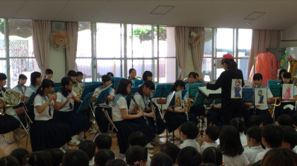 大勢の園児と保護者・教職員の方々の前で楽しく演奏することができました。特に子どもたちが知っている曲名をアナウンスすると、喜びの歓声が上がったり、音楽が流れると踊りだしたりして、演奏側の中学生も乗ってきて笑みがこぼれていました。