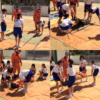 2年生は、「防災訓練」として、AEDによる救護訓練、担架による搬送訓練、てんぷら油による火の体験、水消火器による消火訓練、火災による煙体験等、学級ごとに体験し、防災に関するポイントを教えていただきました。