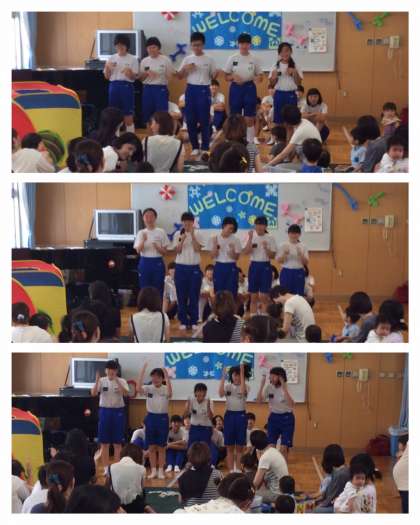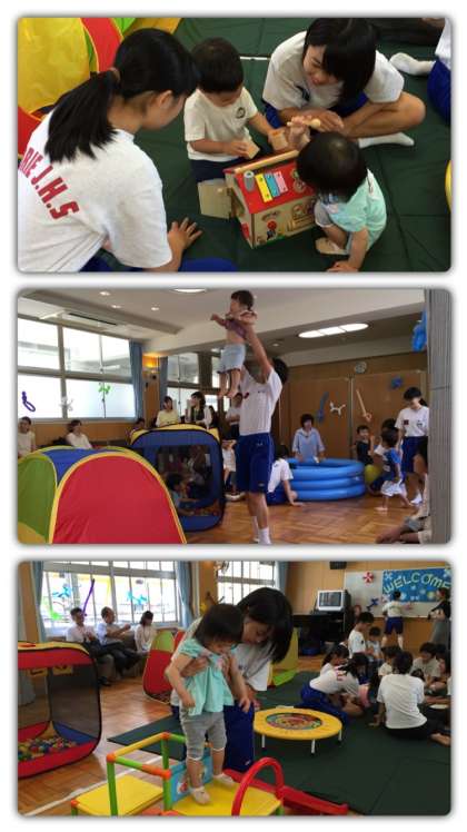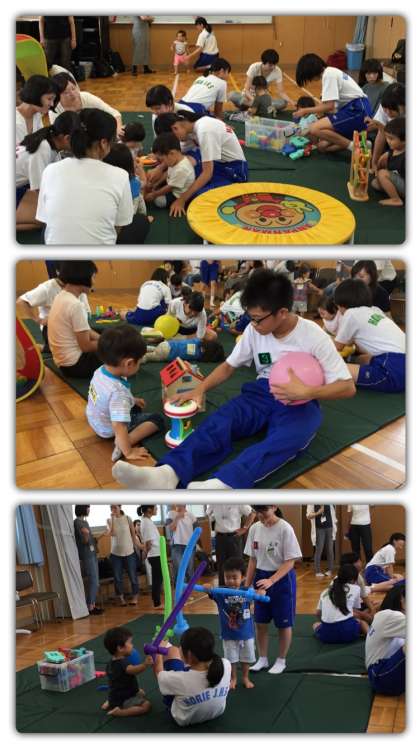 乳幼児たちはとても楽しそうに、積極的に中に入り、興味津々で遊びに夢中になっていました。中学生の皆さんも、元気でかわいい子どもたちに合わしながら、まるで年の離れた兄弟姉妹のように上手に遊んでくれていました