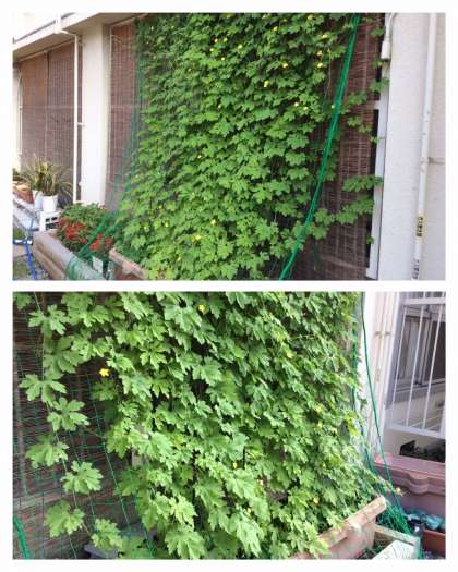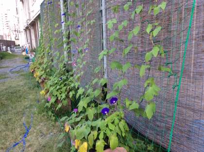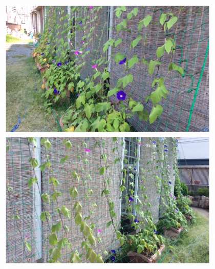 緑のカーテンが大きくなりました。先日(7月29日)の写真からさらに、朝顔の花がたくさん咲いている様子がわかります。(上段は、8月1日、中断、下段は8月4日朝です。)