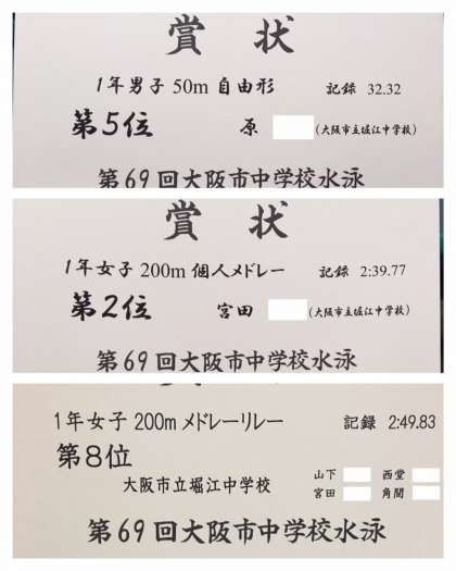三日間の大阪市中学校学年別水泳競技大会が終了しました。写真にあるように、賞状も6枚取ることができました。さらに一年生女子は、大阪市で総合8位に入賞しました。これからも練習を積んで、3年後には優勝しましょう。がんばれ、水泳部!