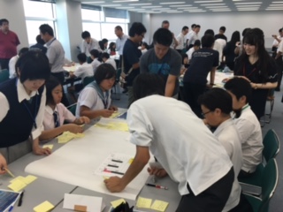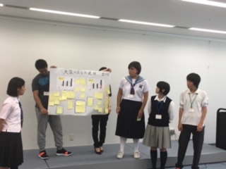 9月11日(日)大阪府咲洲庁舎にて、第2回スマホサミットのワークショップが行われました。堀江中学校からは、生徒会の近藤くんと小田原さんが参加しました。はじめは少し緊張気味だった二人ですが、アドバイザー役の大学生が考えてくれたゲームで緊張もほぐれ、そこからは積極的に発言し、グループでの話し合いを行いました。