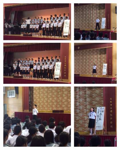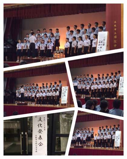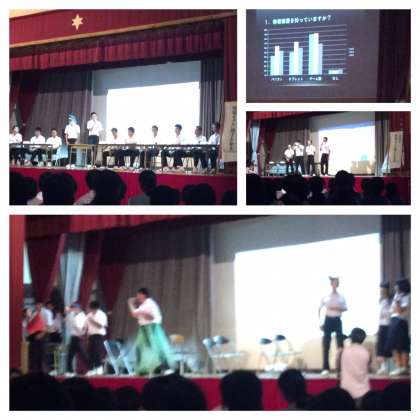 文化発表会の午前は、舞台発表鑑賞と、展示発表見学の二部構成です。舞台発表では、一昨日行われました合唱コンクールの優秀クラスの発表です。当然といえば当然ですが、優秀だと思った1年生より2年生、2年生より3年生といったように学年の違いを見せつけられた発表でした。さらに、生徒会から「情報モラル」についての発表でした。4月に全校生徒に取ったアンケートをもとに集計と分析をしたものをグラフにしての発表でした。貴重なデータと考察がありました。そして、有志による笑いながら学べる情報モラルの演劇も楽しかったです。