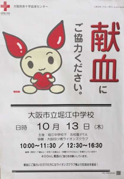 本日10月13日(木)堀江中学校で献血を実施しています。下記の時間帯に行っておりますので、保護者、地域の皆様、どうかご協力をお願いいたします。