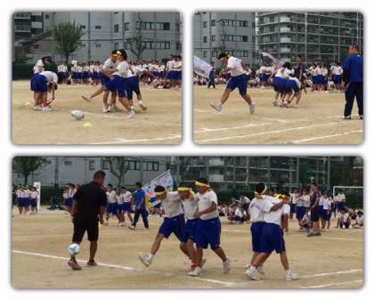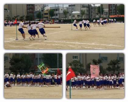学年団体競技ではクラスで団結して競い合いました。1年生は背中渡しリレー、2年生はワンオールリレー、3年生はハリケーンリレーで盛り上がりました。
