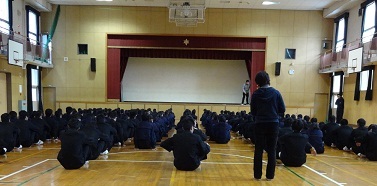 2時間目から1,2,3年と順番に体育館で、2学期の反省や、冬休み、3学期の過ごし方について話がありました。(画像は3年生の様子です)