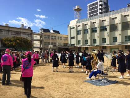 10月29日(土)午前10時半頃、西区長さんとともに地域の方々総勢70名ぐらいで堀江中に来られました。西区のいろんな場所を巡っておられ、堀江中が一つのスポットになっているようです。そこで、吹奏楽部の皆さんが演奏をして皆さんを迎えました。とても喜んでおられました。