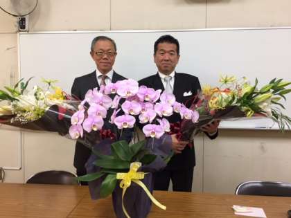 この度の異動により、中西利彦校長先生の後任として、柴島中学校より山本裕康校長先生をお迎えしました。また、今年度から副校長先生として小西良一先生もお迎えしました。早速4月3日(月)にPTAによる着任式をしました。堀江中学校の校訓「誇り・理想・笑顔」が輝きを増すよう、今後ともよろしくお願いいたします。