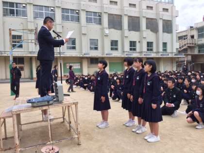 3月に行われました「女子バスケットボール1年生大会」において、港南中学校との合同チームで出場し、第3ブロック第3位を獲得しました。遅くなりましたが、本日、表彰しました。これを励みに今後もさらに頑張ってください。