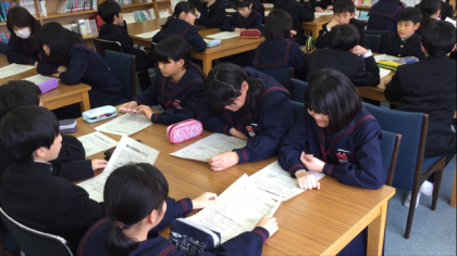 4月19日(水)1年生を対象に図書館の利用の仕方を説明しました。水曜日は、学校図書館補助員の芝崎さん、学校元気アップコーディネーターの松下さん、また他の曜日には他のコーディネーターの方々が図書館におられますので、お昼休みや放課後に是非とも図書館を活用してください。一人一人に配られた図書カードを忘れずに持って来てください。また、図書館は、テスト前などの放課後には自主学習教室としても利用してもらっています。