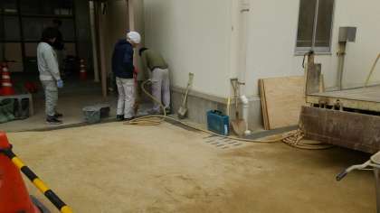 漏水調査の結果、エレベータ付近の地中に埋設された消火管から水が漏れていることが判明。業者に依頼し、4月15日に補修しました。