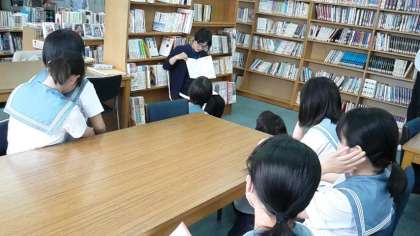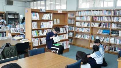 5月17日(水)昼休み、学校図書館補助員の芝崎さんによる「読み聞かせ活動」が行われました。初めての試みです。図書館を利用する生徒が増える中、さらに本に親しんでもらったり、いいお話を聴くことで気持ちを和らいでもらったりという目的で、補助員さんが始めてくださいました。近くに行って聴く人や、恥ずかしそうに少し離れたところから聴いている人もいて、図書館全体がそのお話に聴き入っていく雰囲気ができたようです。また、継続して水曜日に実施していきたいと思っています。