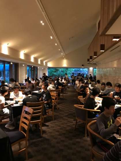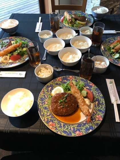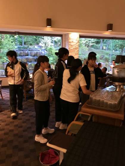 初日の宿泊先、シェラリゾート白馬に到着しました。ラフティングの興奮と心地よい疲れを少しとって夕食です。皆んなの大好物、もりもり食べてます。