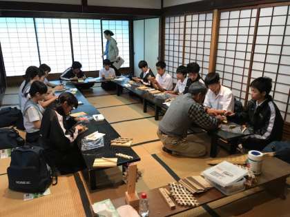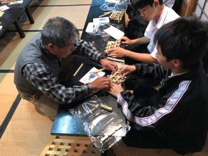 千鳥格子のストラップです。みんな真剣に製作しています。