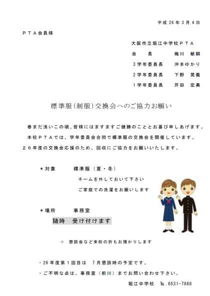 もう使わない堀江中の標準服がありましたら、ご協力をお願いいたします。