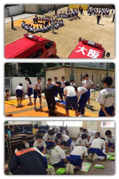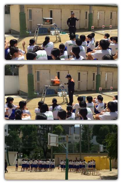 2年生の「防災訓練」では、西消防署の方々のご指導により、様々な災害が起こった場合に対処できるよう、心臓マッサージ体験、水消火器による消火訓練、煙体験、タンカー搬送体験、てんぷら油火災の5種類を、実際に体験しました。