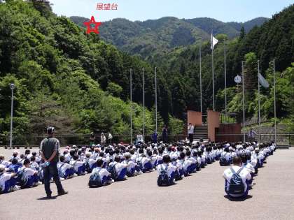 「裏山クイズラリー」の出発前の様子です。 目指すは奥の山に見える展望台です。