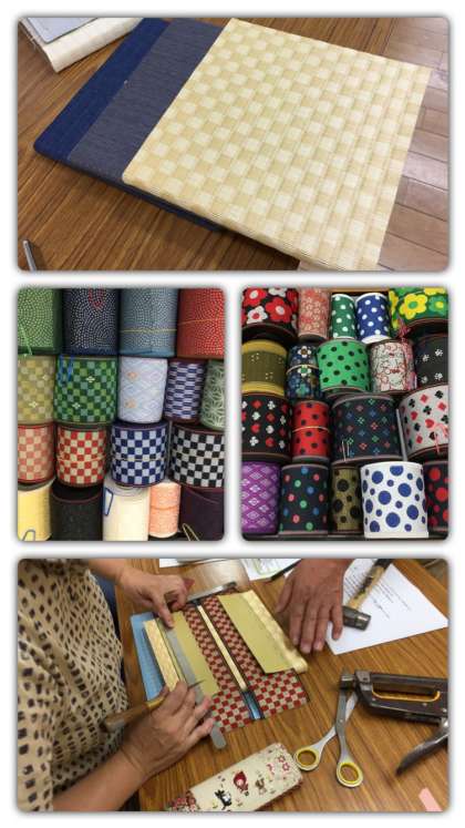 まず、天然イ草の畳や色付きの畳から好きな畳を選び、畳の縁(へり)も様々な模様の中から一つの柄を選びました。その後、次々と作業が手際よく進んでいきました。ボタンの方もどんなボタンしようかと、多くの柄から選ぶのが大変で、とても迷ってしまいました。