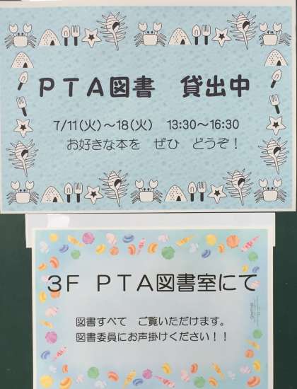 学期末懇談会の初日7月11日(火)から18日(火)までの期間、玄関にてPTA図書委員会による図書の貸し出しを行っています。また、3階のPTA図書室の本も見ていただき、貸し出しもできます。新刊も揃えていますので、どんどんご活用ください。