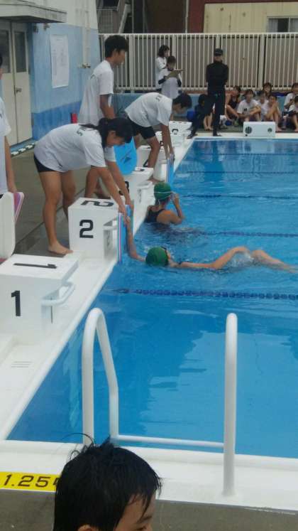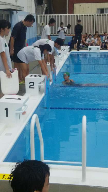 背泳では手や頭を強打しないようにビート板で保護しました。