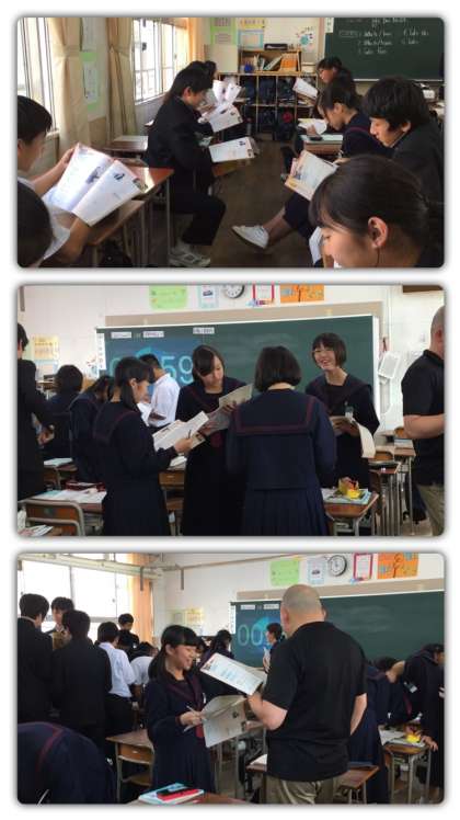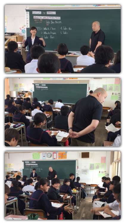 10月26日(木)6限目、2−4組にて清水先生による英語科の研究授業が行われました。「道案内」という単元で、目的地への乗り物の行き方を尋ねたり、教えたりする言い方を学ぶ授業でした。清水先生とC-NETのパトリック先生とのやりとりを見て、それを隣の人とペアワークでやりとりをしたり、自由に相手を見つけて対話をしたりなど、道案内のセンテンスを活用しながら活発に楽しく学習が行われていました。