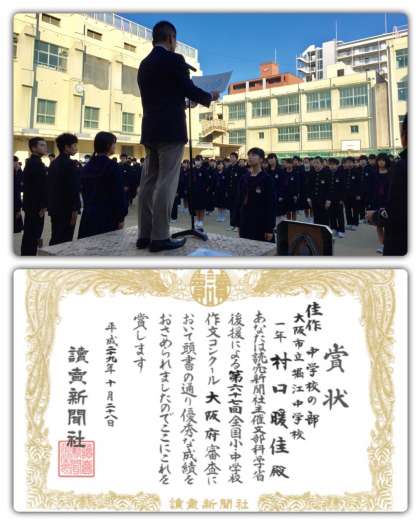読売新聞社主催の「第67回全国小・中学校作文コンクール」に於いて、1年生の村口暖佳さんの作品「私の姉、すず」が佳作に入賞しました。おめでとうございます!